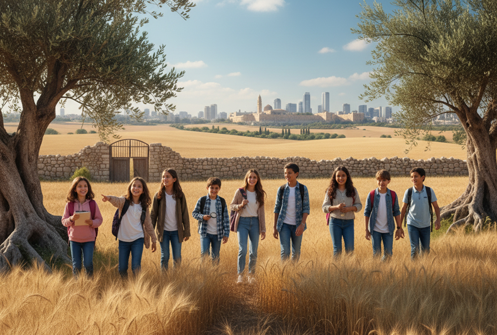 קבוצת ילדים מגוונים הולכים בשדה חיטה זהובים, מול שער אבן עתיק ועצי זית, עם נוף ירושלים ברקע, כולל כיפת הסלע. מסע חווייתי לשורשים יהודיים וישראליים, חינוך ערכי לזהות ושייכות.